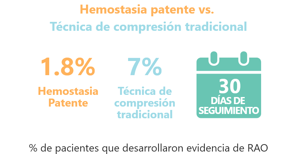 En comparación con las técnicas de compresión tradicionales, la hemostasia patente minimiza la evidencia de oclusión de la arteria radial y complicaciones del acceso vascular.6