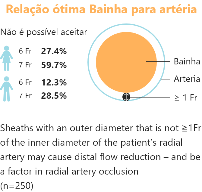 Bainhas com um diâmetro externo que não seja ≧1Fr do diâmetro interno da artéria radial do paciente podem causar redução de fluxo distal - e ser um fator na oclusão de artéria radial5